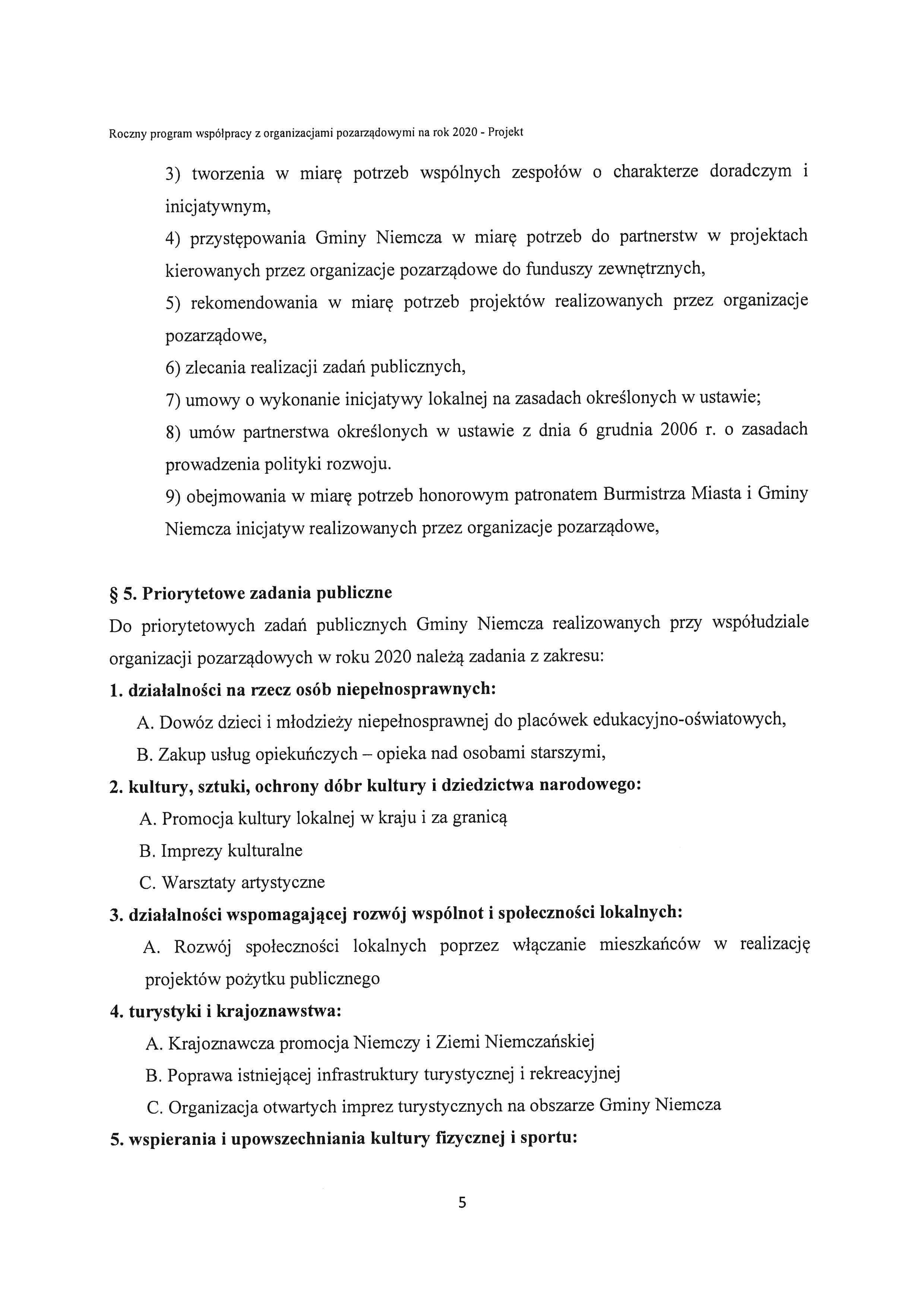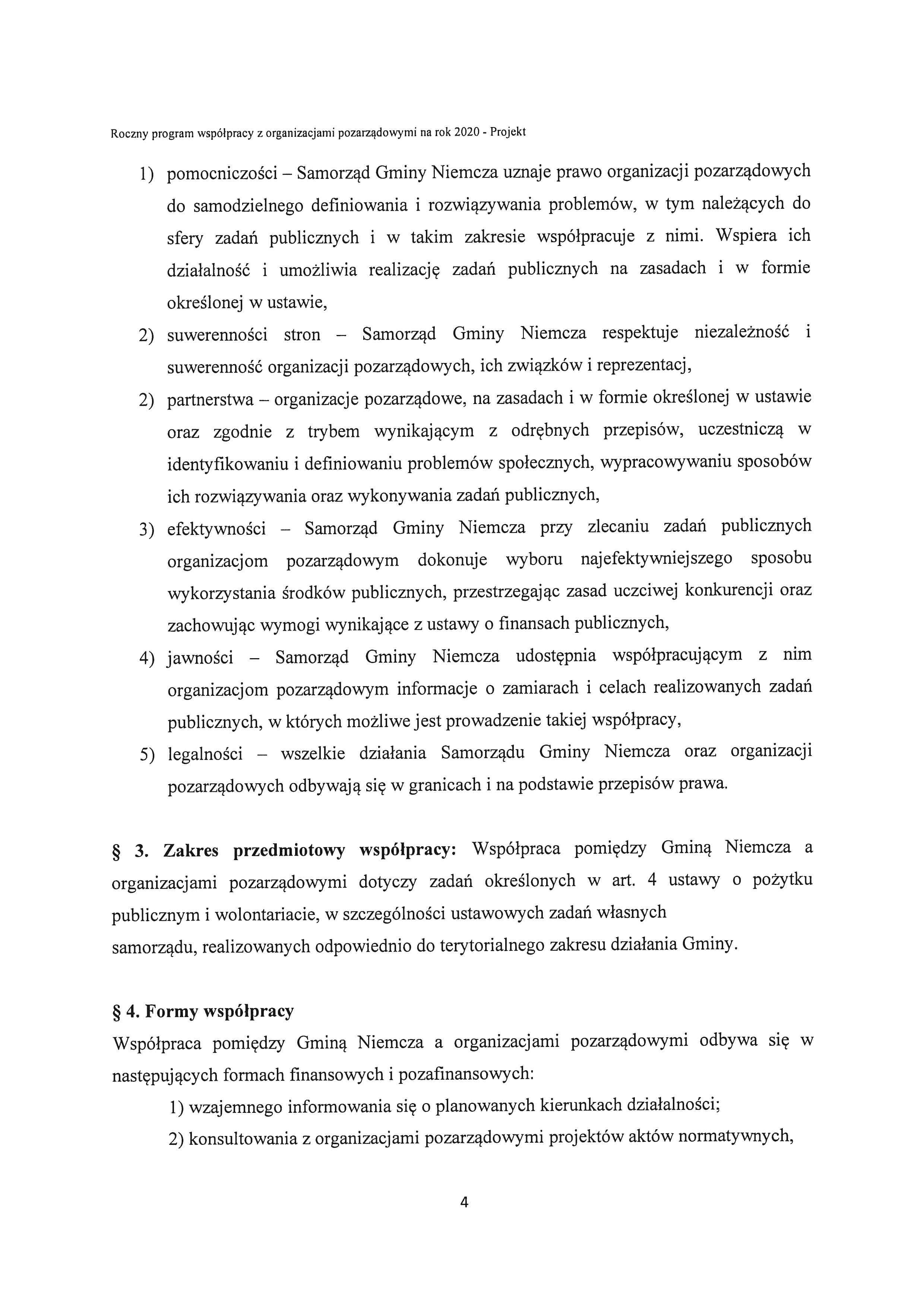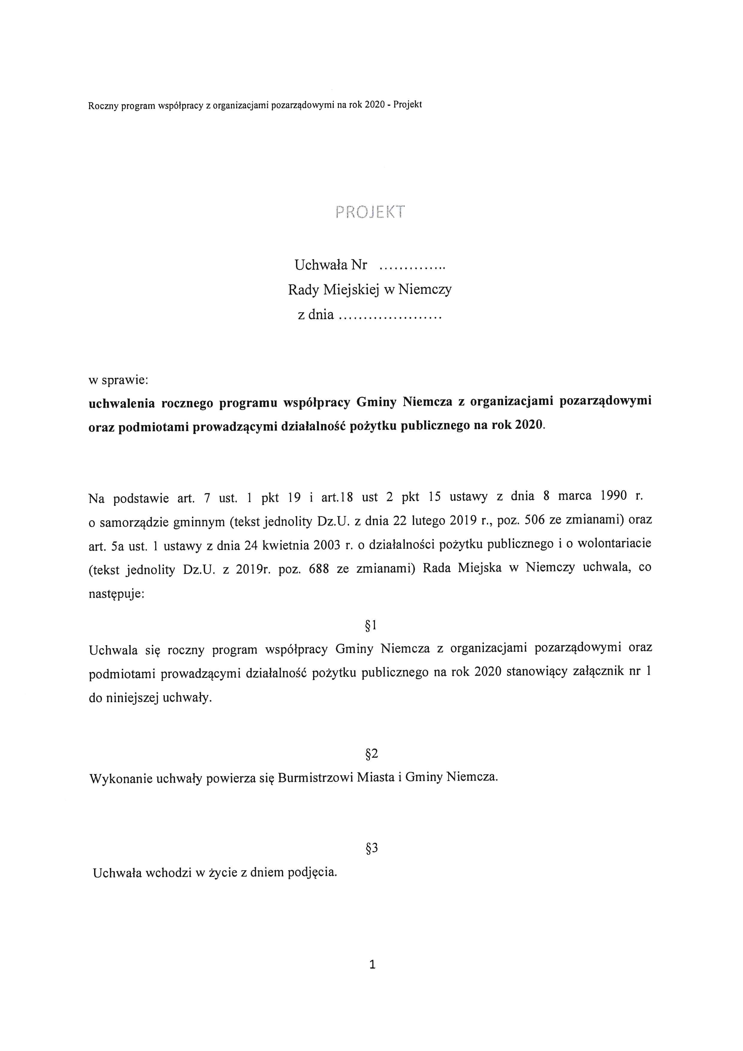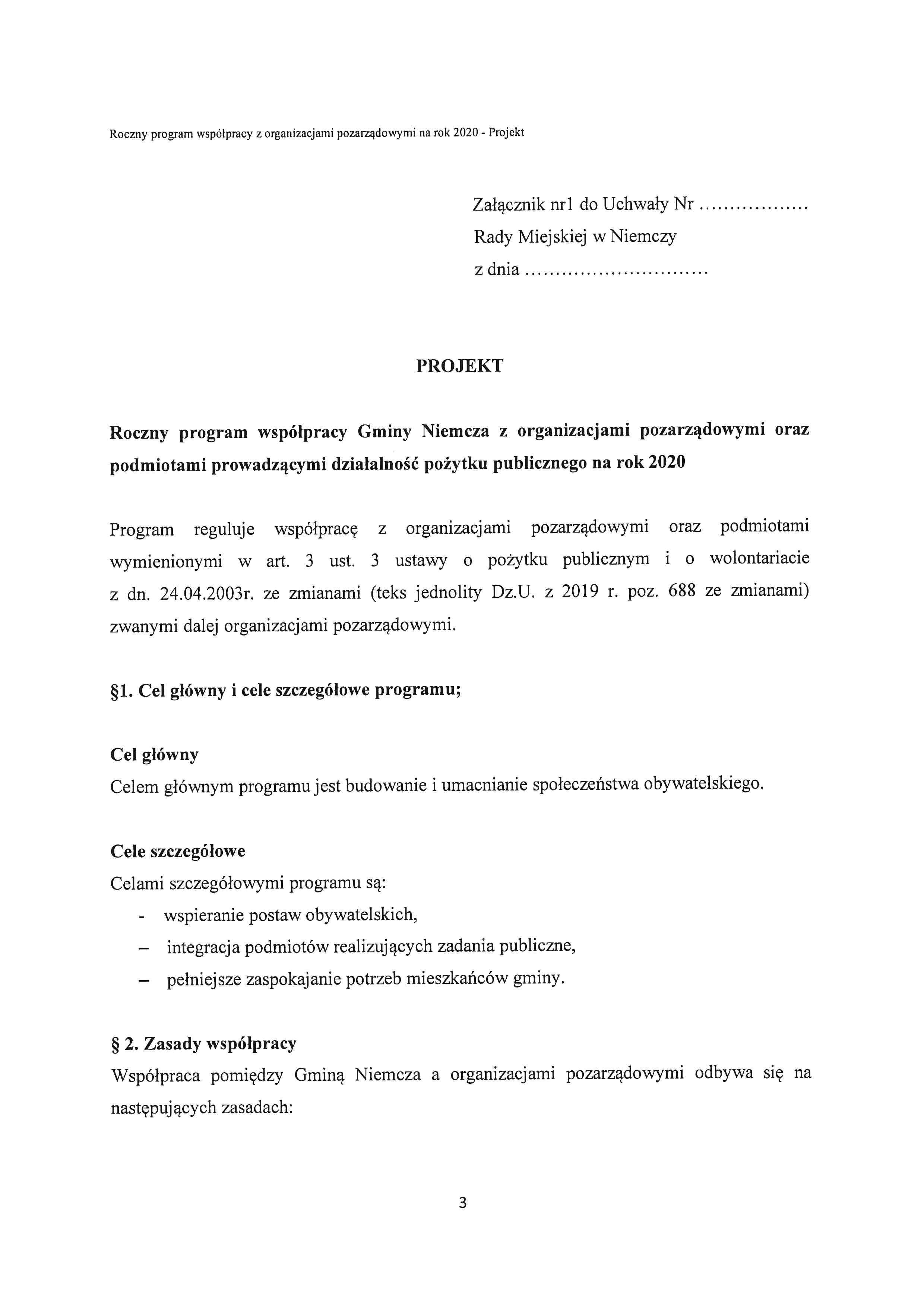 Projekt rocznego programu współpracy Gminy Niemcza z organizacjami pozarządowymi oraz podmiotami prowadzącymi działalność pożytku publicznego na rok 2020